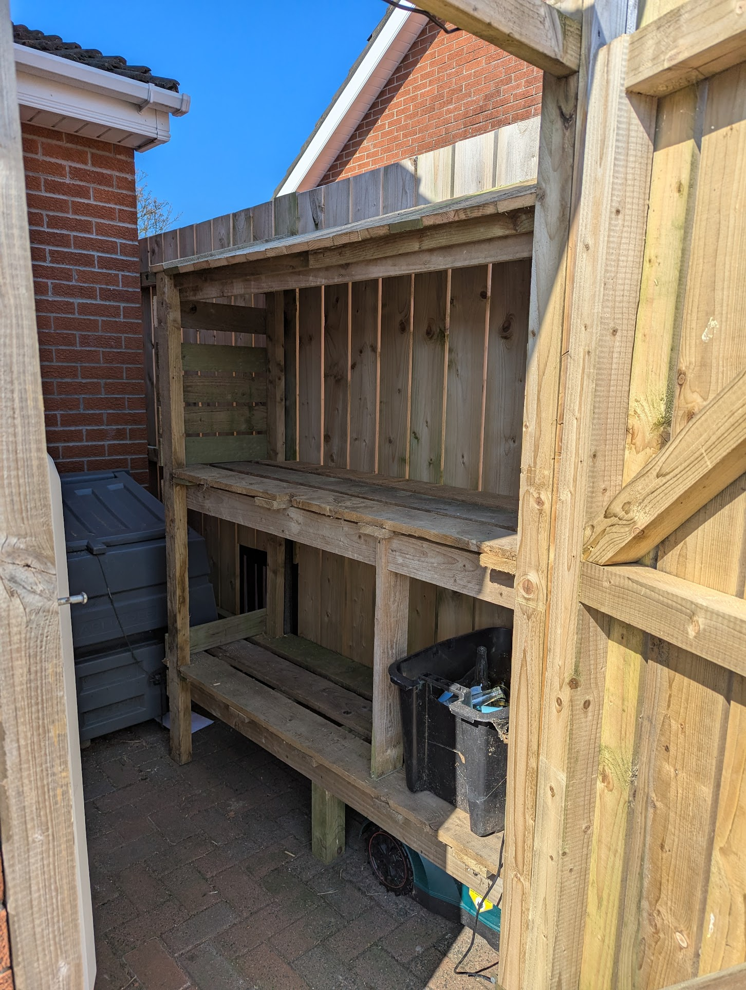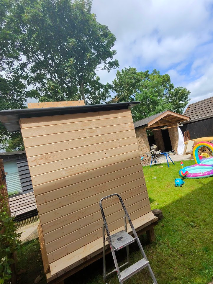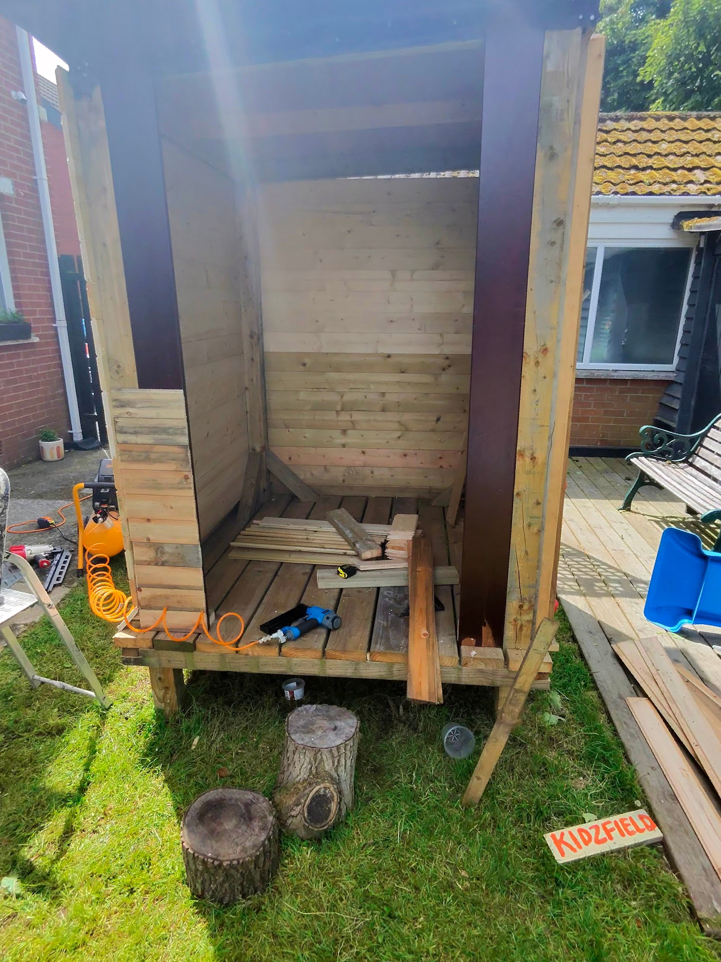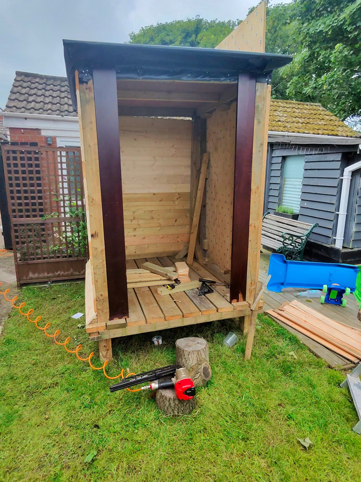 The roof and the left and top of the back I had to buy wood (TGV 8 of 3/4″x5″ @4.6m) and 2 of 4×2 @3m and I had to get some more damp course to weatherproof the roof (I had some left from the outdoor space build, but not enough.)