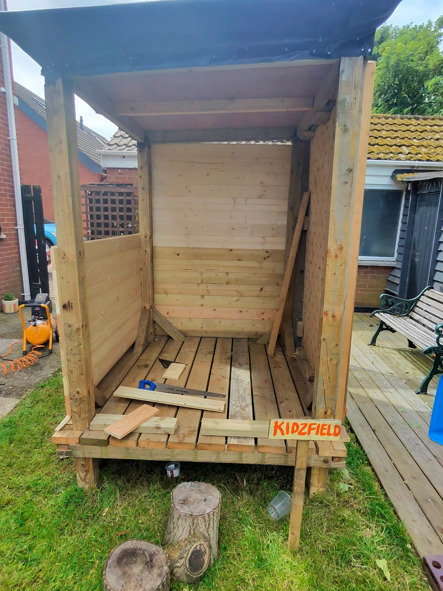 Here is the mostly finished article all that is missing in this picture is the hammock that is hanging diagonally between the posts that was made from paracord and an old fitted bed sheet joined with a sheet bend.